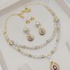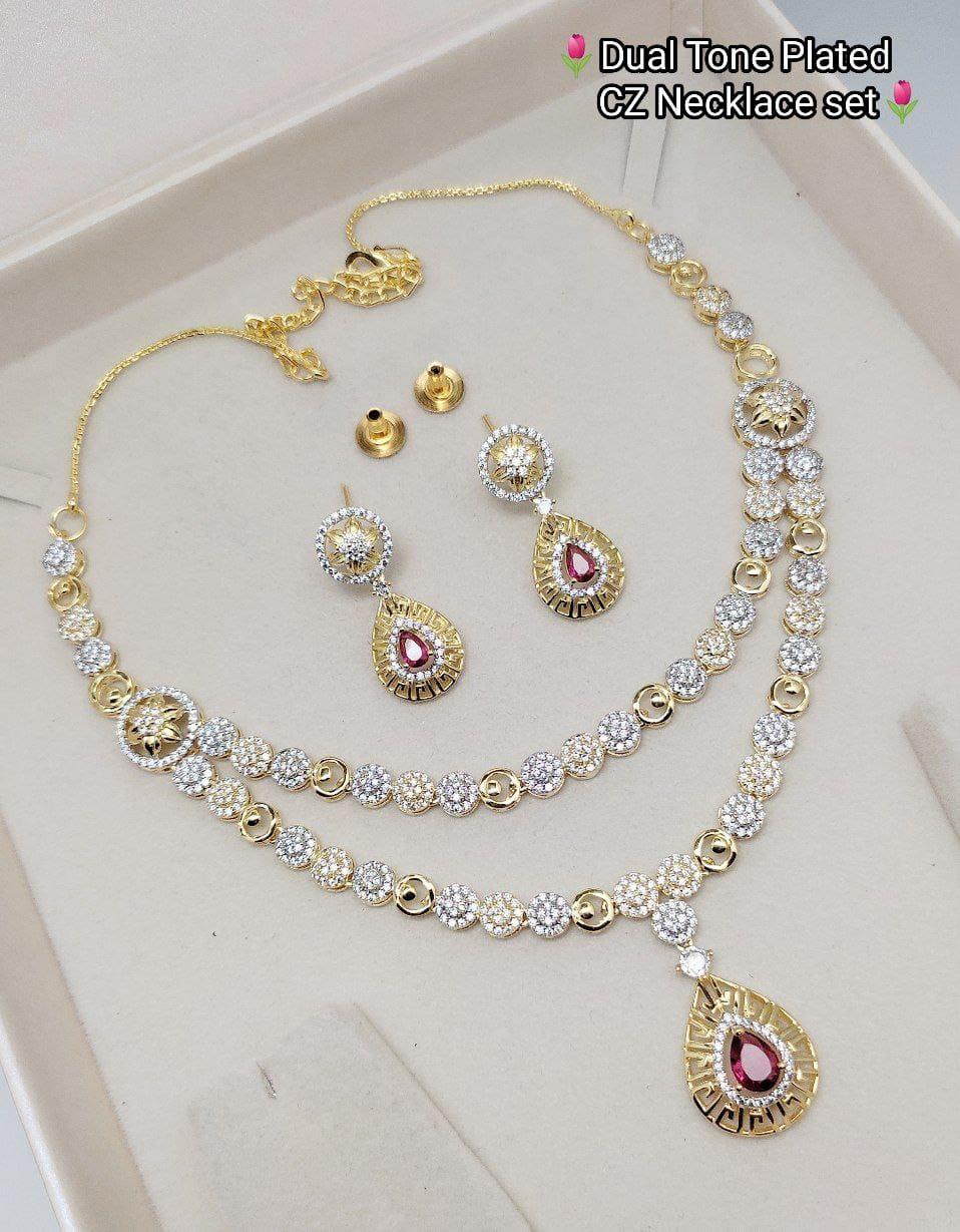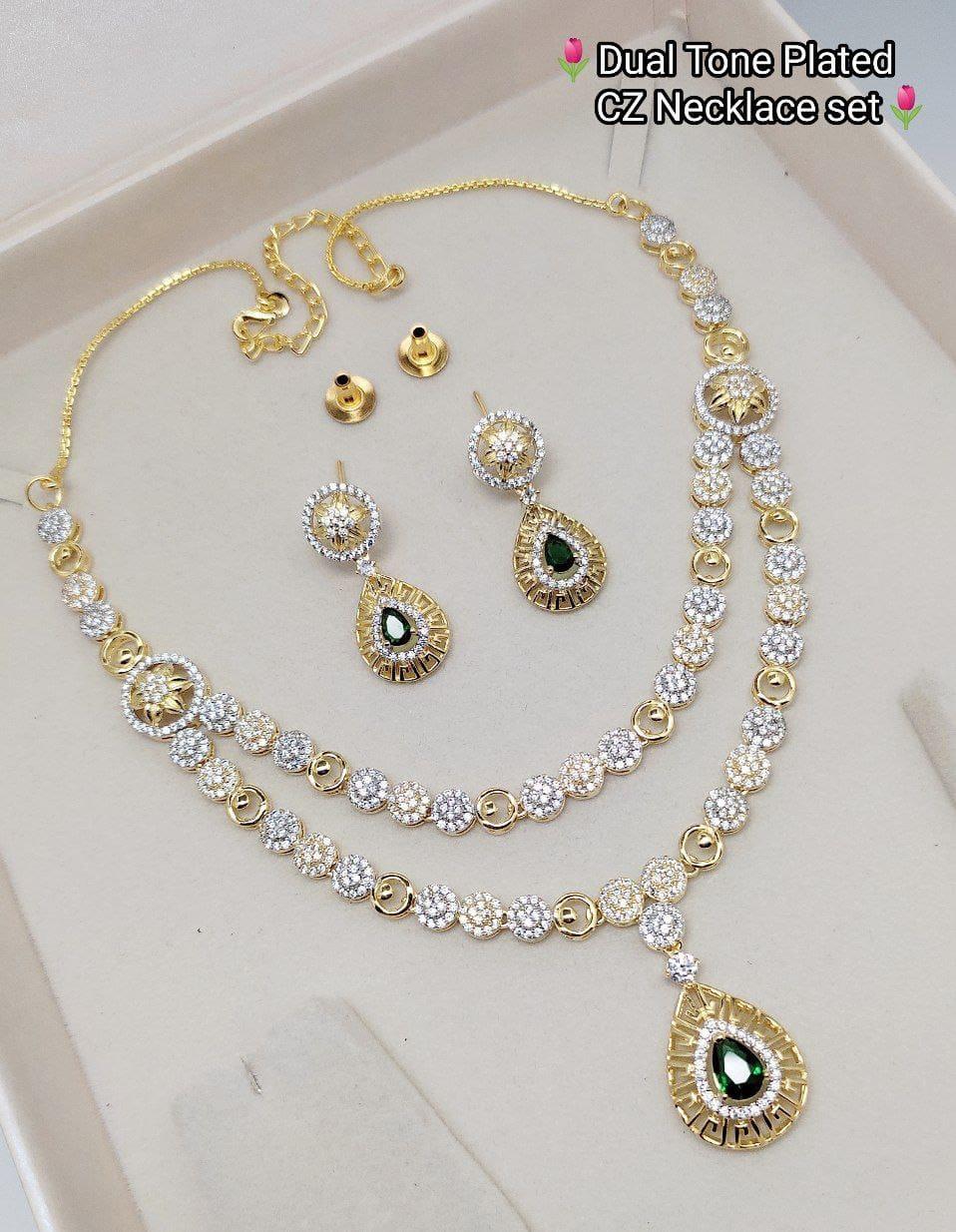 Dual Tone CZ Two-Layer Necklace Set with Green Emerald Pendants