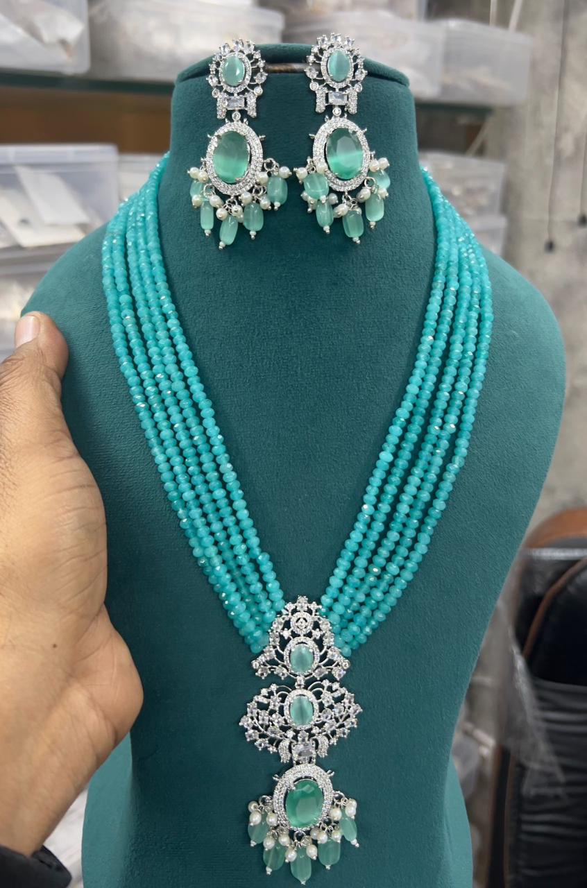 Emerald Green Long Necklace Set with Earrings. This traditional multi-layered Rani Haar features silver-toned CZ stones and pearls. Ideal for Indian weddings.