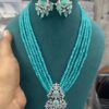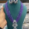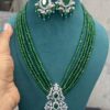 Emerald Green Long Necklace Set with Earrings. This traditional multi-layered Rani Haar features silver-toned CZ stones and pearls. Ideal for Indian weddings.