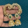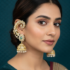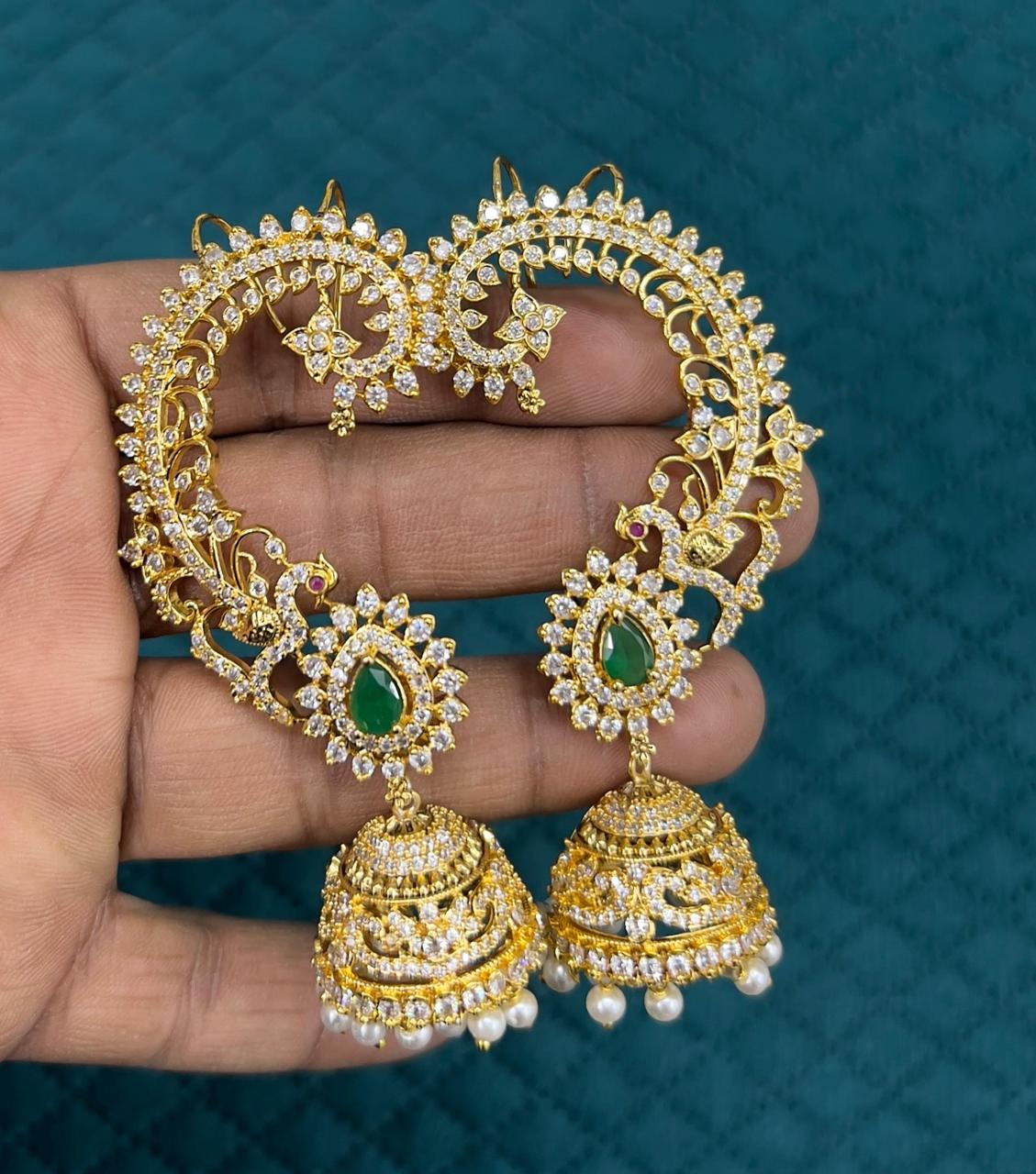 Green Emerald & White Stone Ear Wrap Jhumkas, Indian Wedding Jewelry, Statement Gold Plated Ear Cuffs with Jhumka Drops, Festive Ethnic Wear