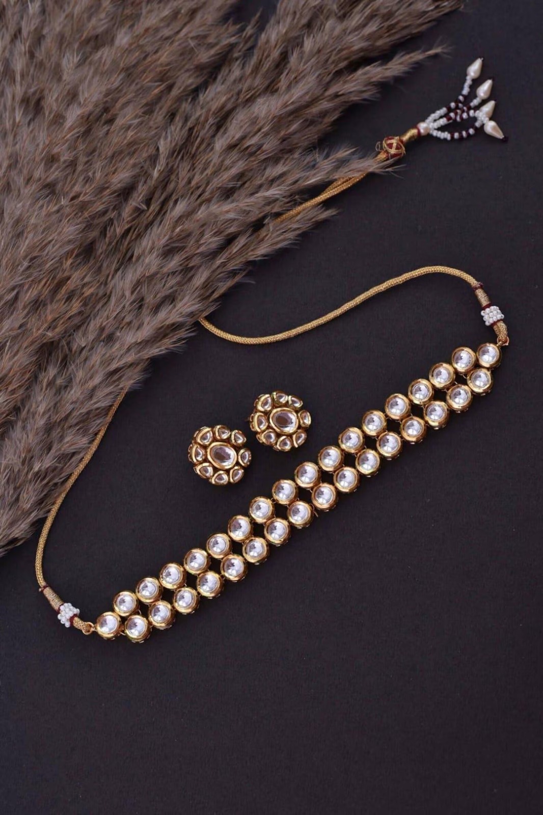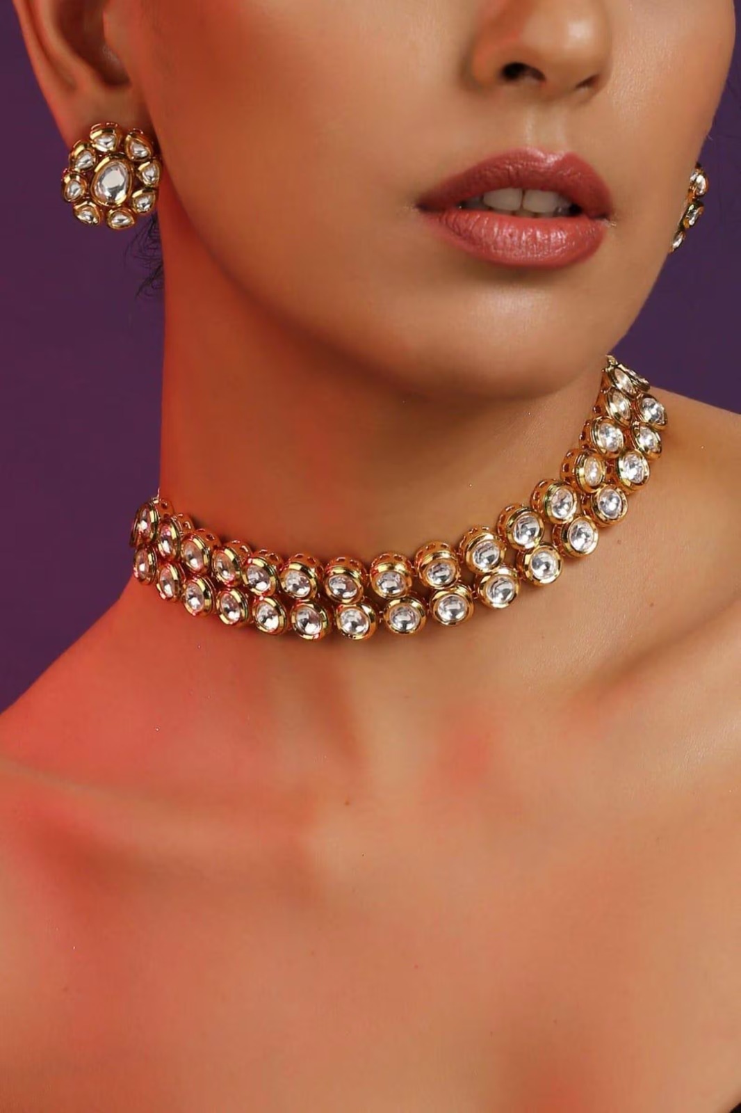 Gold Plated Kundan Choker Necklace Set with Matching Stud Earrings | Uncut Polki Indian Bridal Jewelry | Traditional Wedding Choker for Women | Sabyasachi Inspired Ethnic Jewelry Set
